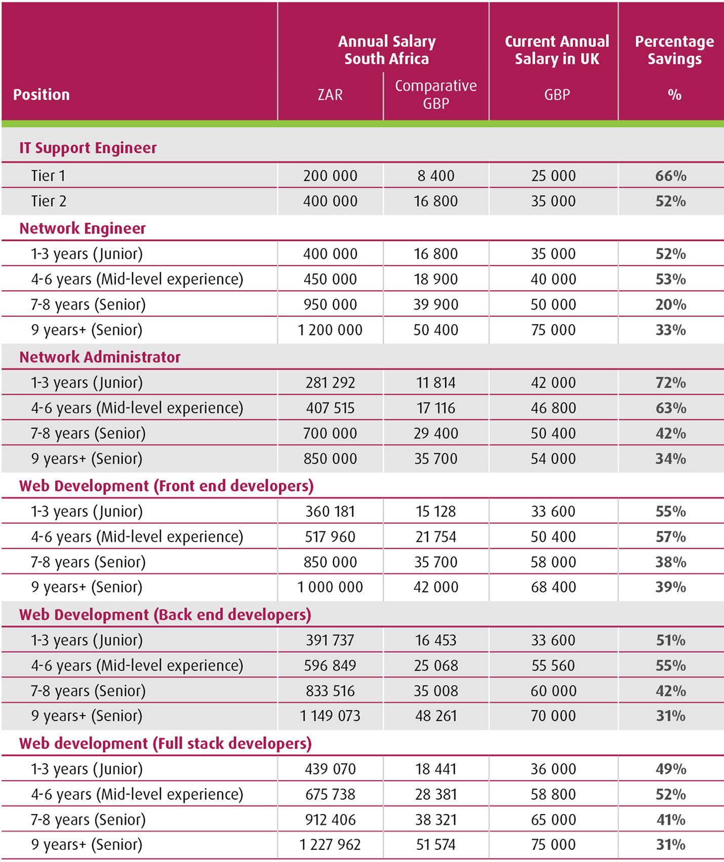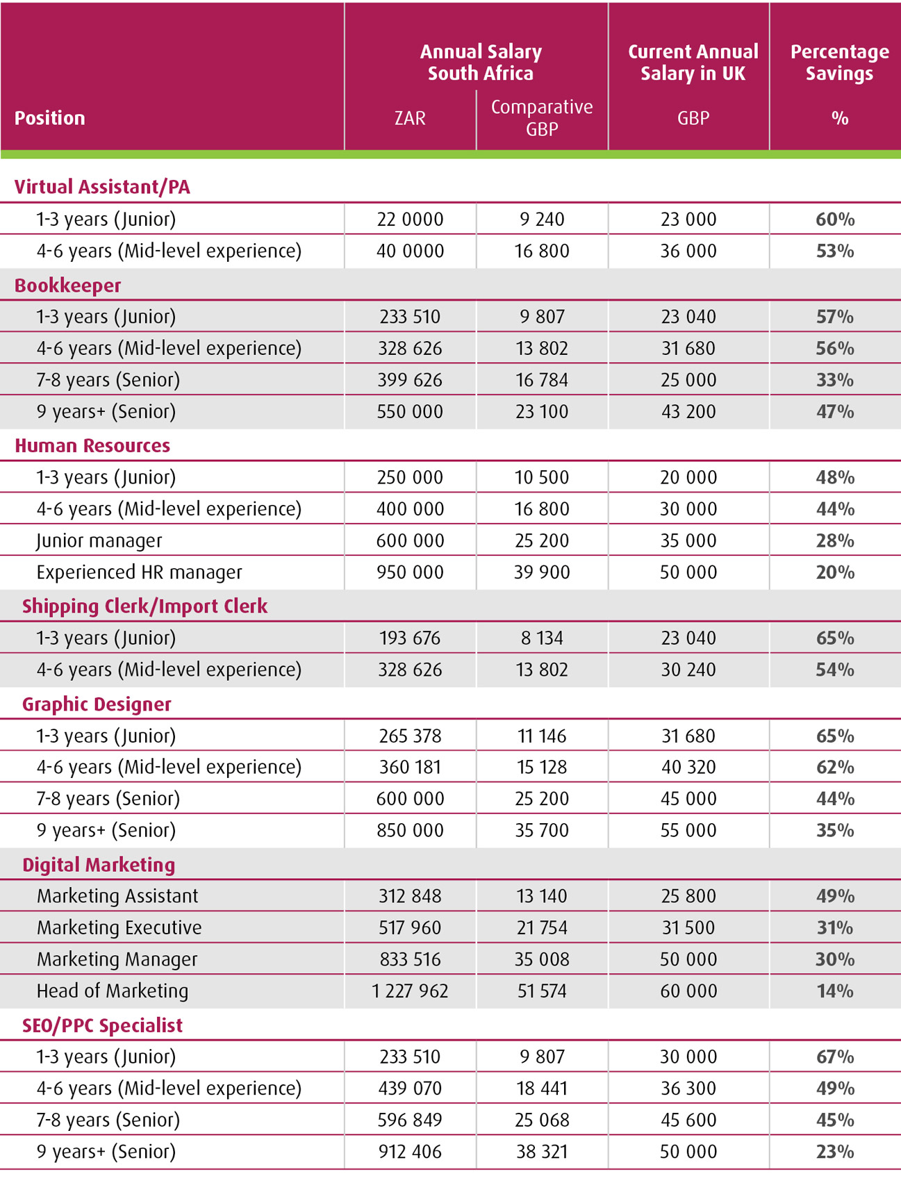 The cost comparison is between the annual salary and hourly rate of South African (ZAR) staff versus staff based in the United Kingdom (GBP). These are estimations of salary costs for specific roles, which will vary depending on the job description and experience required.